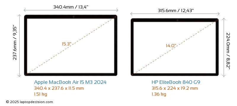 HDMIEliteBook 840 G9 cuenta con un puerto HDMI (1x HDMI 2.0) para conectar a monitores externos. MacBook Air 15 M3 2024 no tiene puerto HDMI.