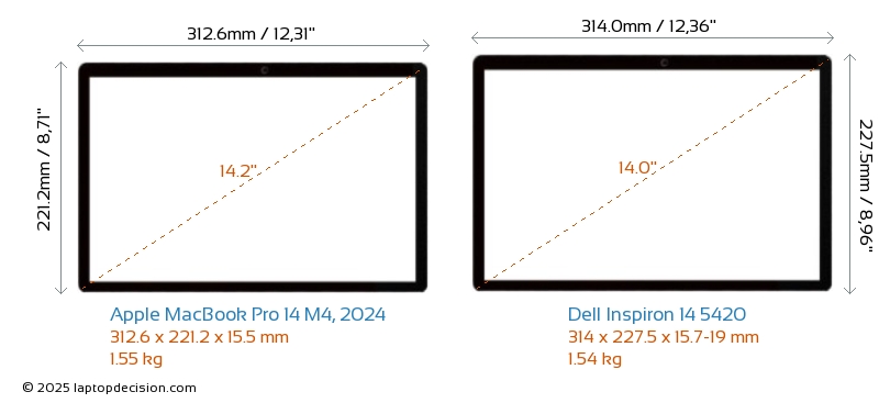 Thunderbolt MacBook Pro 14 M4, 2024 está equipado con un puerto Thunderbolt 4. Inspiron 14 5420 no tiene puerto Thunderbolt.