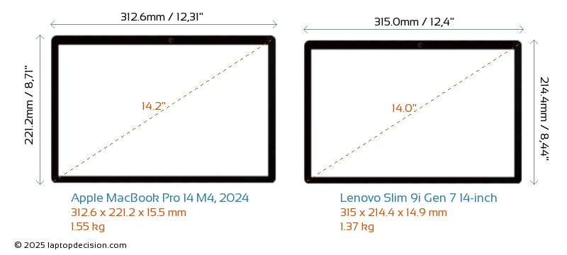 HDMI MacBook Pro 14 M4, 2024 cuenta con un puerto HDMI (1x HDMI 2.1) para conectar a monitores externos. Slim 9i Gen 7 14-inch no tiene puerto HDMI.