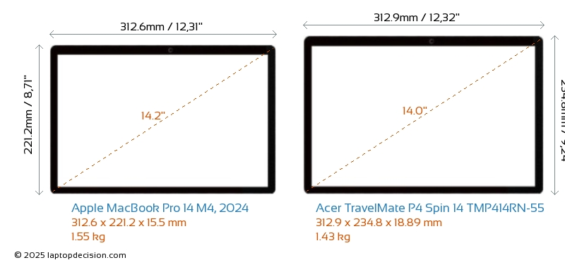 HDMIAmbos MacBook Pro 14 M4, 2024 y TravelMate P4 Spin 14 TMP414RN-55 cuentan con un puerto HDMI (1x HDMI 2.1) para conectar a monitores externos.