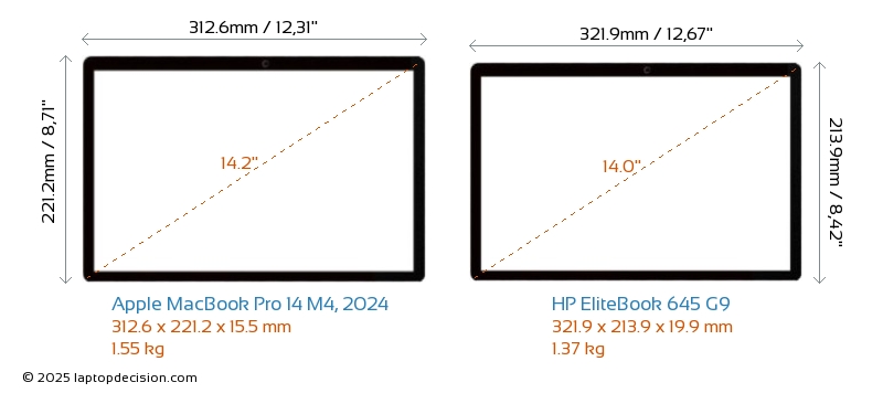 HDMIAmbos MacBook Pro 14 M4, 2024 y EliteBook 645 G9 cuentan con un puerto HDMI (1x HDMI 2.1) para conectar a monitores externos.