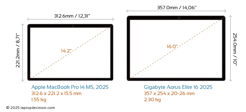 HDMIAmbos MacBook Pro 14 M5, 2025 y Aorus Elite 16 2025 cuentan con un puerto HDMI (1x HDMI 2.1) para conectar a monitores externos.