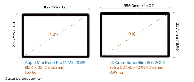 HDMI MacBook Pro 14 M5, 2025 cuenta con un puerto HDMI (1x HDMI 2.1) para conectar a monitores externos. Gram SuperSlim 15.6 2023 no tiene puerto HDMI.