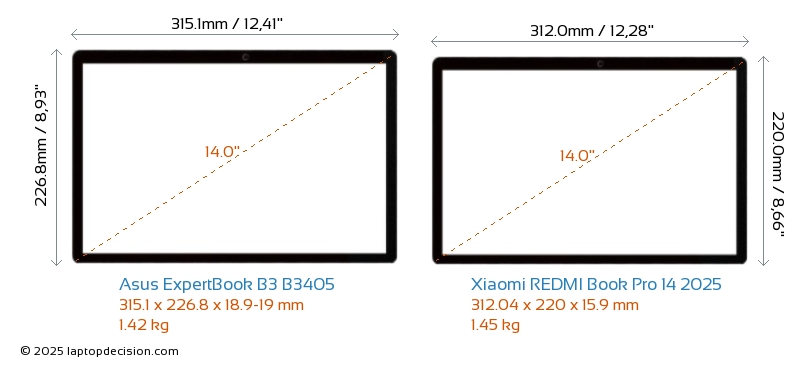 USBAmbos ExpertBook B3 B3405 y REDMI Book Pro 14 2025 cuentan con 2x USB 3.2 puertos USB-A.Ambos ExpertBook B3 B3405 y REDMI Book Pro 14 2025 cuentan con 2x USB 4.0 puertos USB Type-C.