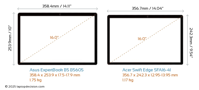 USBAmbos ExpertBook B5 B5605 y Swift Edge SFA16-41 cuentan con 2x USB 3.2 puertos USB-A.Ambos ExpertBook B5 B5605 y Swift Edge SFA16-41 tienen puertos USB Type-C. ExpertBook B5 B5605 tiene 2x USB 4.0 puertos USB Type-C, mientras que Swift Edge SFA16-41 tiene 2x USB 3.2 puertos USB Type-C.