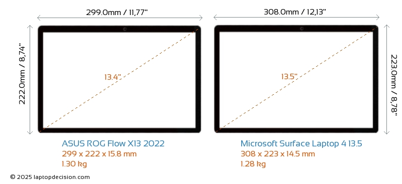 HDMI ROG Flow X13 2022 cuenta con un puerto HDMI (1x HDMI 2.0) para conectar a monitores externos. Surface Laptop 4 13.5 no tiene puerto HDMI.