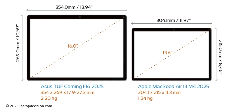 HDMI TUF Gaming F16 2025 cuenta con un puerto HDMI (1x HDMI 2.1) para conectar a monitores externos. MacBook Air 13 M4 2025 no tiene puerto HDMI.