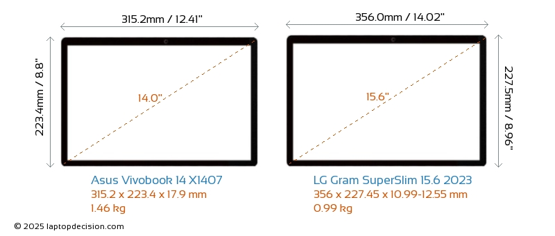 HDMI Vivobook 14 X1407 cuenta con un puerto HDMI (1x HDMI 1.4) para conectar a monitores externos. Gram SuperSlim 15.6 2023 no tiene puerto HDMI.
