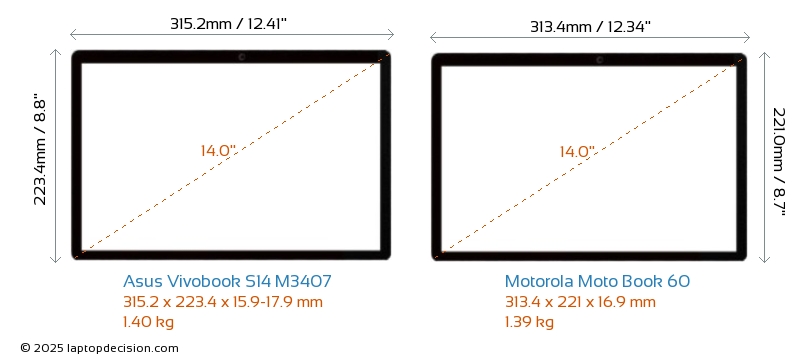 USBAmbos Vivobook S14 M3407 y Moto Book 60 cuentan con 2x USB 3.2 puertos USB-A.Ambos Vivobook S14 M3407 y Moto Book 60 cuentan con 2x USB 4.0 puertos USB Type-C.