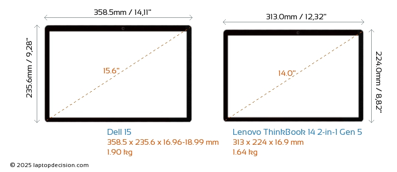 HDMIAmbos 15 y ThinkBook 14 2-in-1 Gen 5 cuentan con un puerto HDMI. 15 ofrece 1x HDMI 1.4, mientras que ThinkBook 14 2-in-1 Gen 5 ofrece 1x HDMI 2.1.