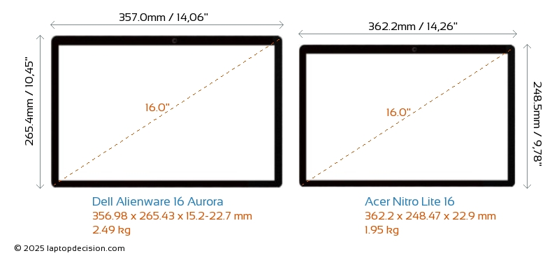 USBAmbos Alienware 16 Aurora y Nitro Lite 16 cuentan con 2x USB 3.2 puertos USB-A.Ambos Alienware 16 Aurora y Nitro Lite 16 tienen puertos USB Type-C. Alienware 16 Aurora tiene 2x USB 4.0 puertos USB Type-C, mientras que Nitro Lite 16 tiene 1x USB 4.0 puertos USB Type-C.