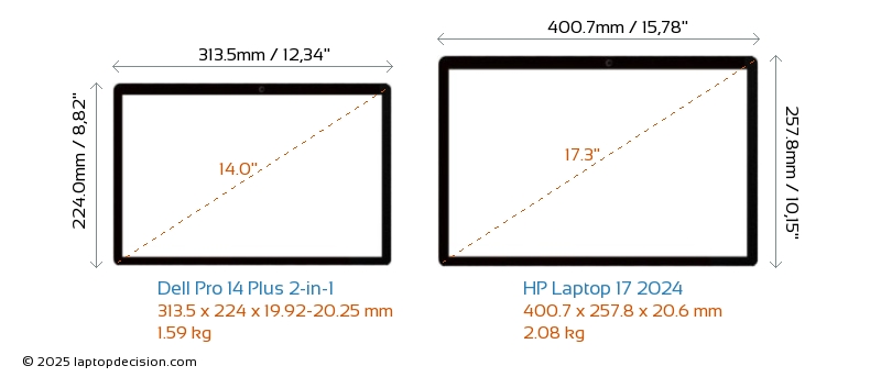 USBAmbos Pro 14 Plus 2-in-1 y Laptop 17 2024 cuentan con 2x USB 3.2 puertos USB-A.Ambos Pro 14 Plus 2-in-1 y Laptop 17 2024 tienen puertos USB Type-C. Pro 14 Plus 2-in-1 tiene 2x USB 4.0 puertos USB Type-C, mientras que Laptop 17 2024 tiene 1x USB 3.2 puertos USB Type-C.