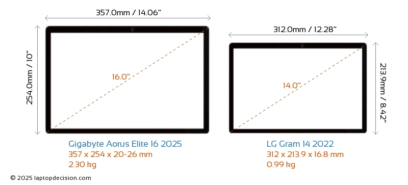 USBAmbos Aorus Elite 16 2025 y Gram 14 2022 cuentan con 2x USB 3.2 puertos USB-A.Ambos Aorus Elite 16 2025 y Gram 14 2022 cuentan con 2x USB 4.0 puertos USB Type-C.