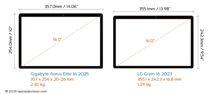USBAmbos Aorus Elite 16 2025 y Gram 16 2023 cuentan con 2x USB 3.2 puertos USB-A.Ambos Aorus Elite 16 2025 y Gram 16 2023 cuentan con 2x USB 4.0 puertos USB Type-C.