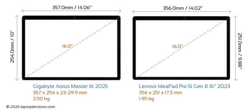 HDMIAmbos Aorus Master 16 2025 y IdeaPad Pro 5i Gen 8 16" 2023 cuentan con un puerto HDMI. Aorus Master 16 2025 ofrece 1x HDMI 2.1, mientras que IdeaPad Pro 5i Gen 8 16" 2023 ofrece 1x HDMI 2.0.