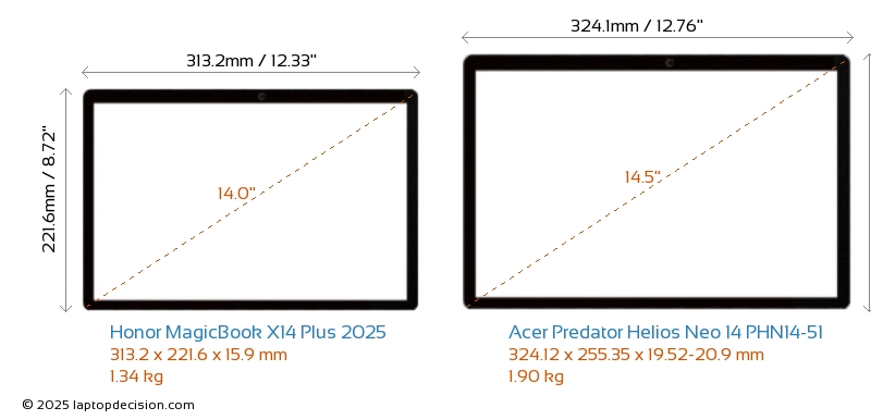 HDMIAmbos MagicBook X14 Plus 2025 y Predator Helios Neo 14 PHN14-51 cuentan con un puerto HDMI. MagicBook X14 Plus 2025 ofrece 1x HDMI 1.4, mientras que Predator Helios Neo 14 PHN14-51 ofrece 1x HDMI 2.1.