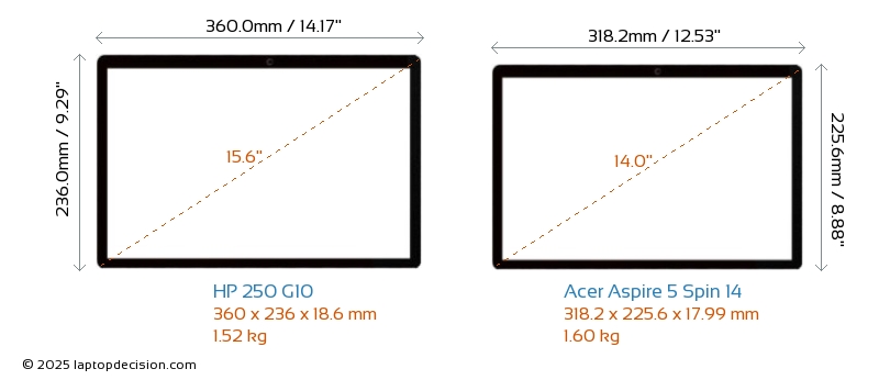 USBAmbos 250 G10 y Aspire 5 Spin 14 cuentan con 2x USB 3.2 puertos USB-A.Ambos 250 G10 y Aspire 5 Spin 14 tienen puertos USB Type-C. 250 G10 tiene 1x USB 3.2 puertos USB Type-C, mientras que Aspire 5 Spin 14 tiene 1x USB 4.0 puertos USB Type-C.