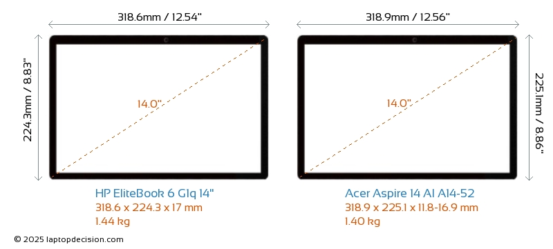 USBAmbos EliteBook 6 G1q 14" y Aspire 14 AI A14-52 cuentan con 2x USB 3.2 puertos USB-A.Ambos EliteBook 6 G1q 14" y Aspire 14 AI A14-52 cuentan con 2x USB 4.0 puertos USB Type-C.