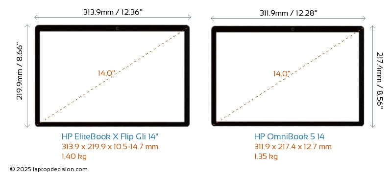 USBAmbos EliteBook X Flip G1i 14" y OmniBook 5 14 cuentan con 1x USB 3.2 puertos USB-A.Ambos EliteBook X Flip G1i 14" y OmniBook 5 14 tienen puertos USB Type-C. EliteBook X Flip G1i 14" tiene 3x USB 4.0 puertos USB Type-C, mientras que OmniBook 5 14 tiene 2x USB 4.0 puertos USB Type-C.