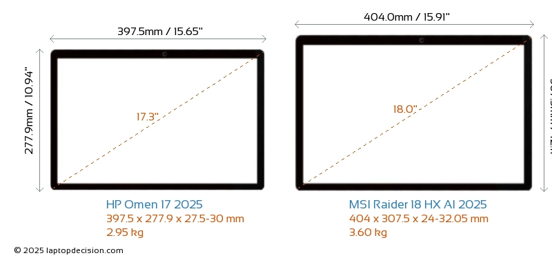 USBAmbos Omen 17 2025 y Raider 18 HX AI 2025 cuentan con 3x USB 3.2 puertos USB-A.Ambos Omen 17 2025 y Raider 18 HX AI 2025 tienen puertos USB Type-C. Omen 17 2025 tiene 1x USB 3.2 puertos USB Type-C, mientras que Raider 18 HX AI 2025 tiene 2x USB 4.0 puertos USB Type-C.
