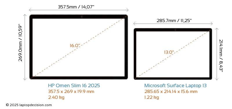 HDMI Omen Slim 16 2025 cuenta con un puerto HDMI (1x HDMI 2.1) para conectar a monitores externos. Surface Laptop 13 no tiene puerto HDMI.