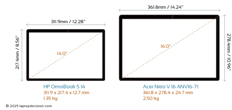 HDMI Nitro V 16 ANV16-71 cuenta con un puerto HDMI (1x HDMI 2.1) para conectar a monitores externos. OmniBook 5 14 no tiene puerto HDMI.