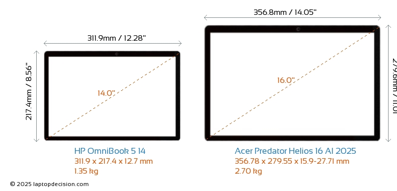 HDMI Predator Helios 16 AI 2025 cuenta con un puerto HDMI (1x HDMI 2.1) para conectar a monitores externos. OmniBook 5 14 no tiene puerto HDMI.