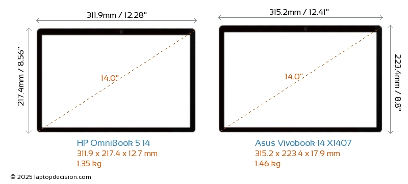 HDMI Vivobook 14 X1407 cuenta con un puerto HDMI (1x HDMI 1.4) para conectar a monitores externos. OmniBook 5 14 no tiene puerto HDMI.