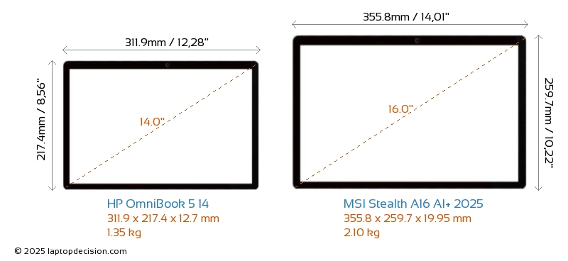 HDMI Stealth A16 AI+ 2025 cuenta con un puerto HDMI (1x HDMI 2.1) para conectar a monitores externos. OmniBook 5 14 no tiene puerto HDMI.