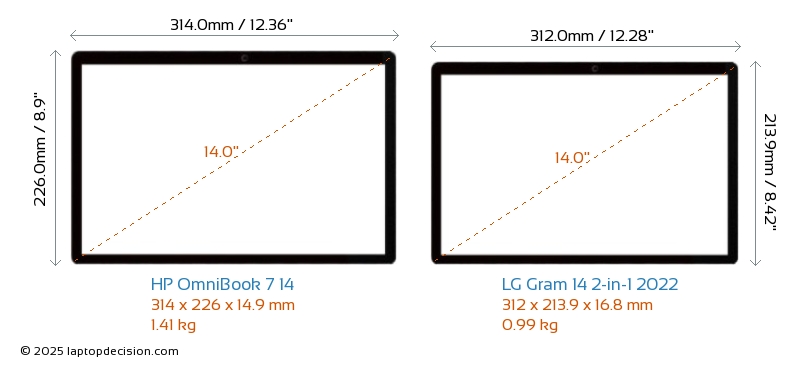 USBAmbos OmniBook 7 14 y Gram 14 2-in-1 2022 cuentan con 2x USB 3.2 puertos USB-A.Ambos OmniBook 7 14 y Gram 14 2-in-1 2022 cuentan con 2x USB 4.0 puertos USB Type-C.