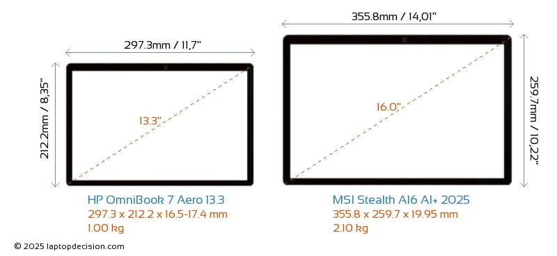 USBAmbos OmniBook 7 Aero 13.3 y Stealth A16 AI+ 2025 cuentan con 2x USB 3.2 puertos USB-A.Ambos OmniBook 7 Aero 13.3 y Stealth A16 AI+ 2025 tienen puertos USB Type-C. OmniBook 7 Aero 13.3 tiene 2x USB 4.0 puertos USB Type-C, mientras que Stealth A16 AI+ 2025 tiene 1x USB 4.0 puertos USB Type-C.
