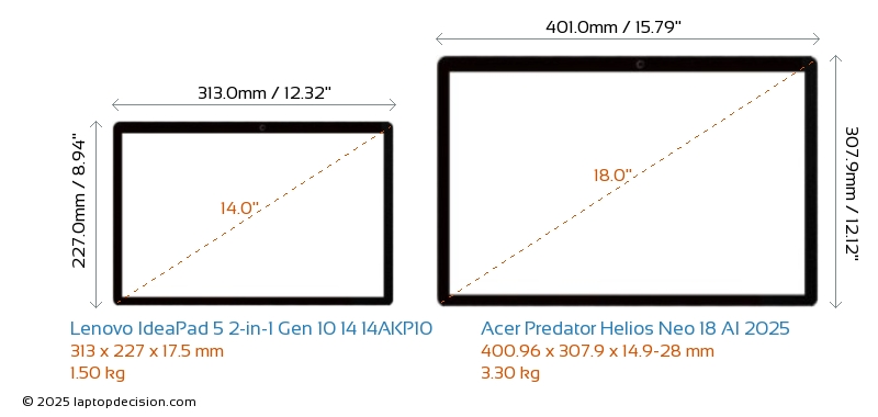 Thunderbolt Predator Helios Neo 18 AI 2025 está equipado con un puerto Thunderbolt 4. IdeaPad 5 2-in-1 Gen 10 14 14AKP10 no tiene puerto Thunderbolt.