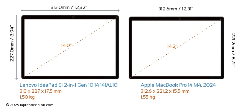 HDMIAmbos IdeaPad 5i 2-in-1 Gen 10 14 14IAL10 y MacBook Pro 14 M4, 2024 cuentan con un puerto HDMI. IdeaPad 5i 2-in-1 Gen 10 14 14IAL10 ofrece 1x HDMI 1.4, mientras que MacBook Pro 14 M4, 2024 ofrece 1x HDMI 2.1.