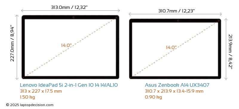 HDMIAmbos IdeaPad 5i 2-in-1 Gen 10 14 14IAL10 y Zenbook A14 UX3407 cuentan con un puerto HDMI. IdeaPad 5i 2-in-1 Gen 10 14 14IAL10 ofrece 1x HDMI 1.4, mientras que Zenbook A14 UX3407 ofrece 1x HDMI 2.1.