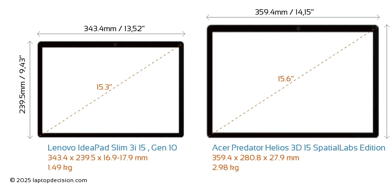 HDMIAmbos IdeaPad Slim 3i 15 , Gen 10 y Predator Helios 3D 15 SpatialLabs Edition cuentan con un puerto HDMI. IdeaPad Slim 3i 15 , Gen 10 ofrece 1x HDMI 1.4, mientras que Predator Helios 3D 15 SpatialLabs Edition ofrece 1x HDMI 2.1.