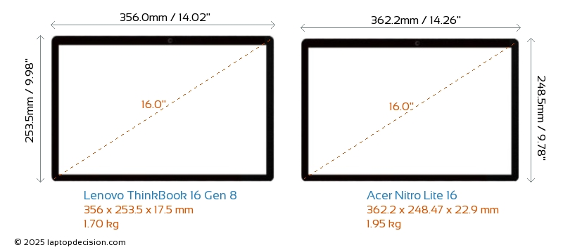 USBAmbos ThinkBook 16 Gen 8 y Nitro Lite 16 cuentan con 2x USB 3.2 puertos USB-A.Ambos ThinkBook 16 Gen 8 y Nitro Lite 16 tienen puertos USB Type-C. ThinkBook 16 Gen 8 tiene 2x USB 4.0 puertos USB Type-C, mientras que Nitro Lite 16 tiene 1x USB 4.0 puertos USB Type-C.