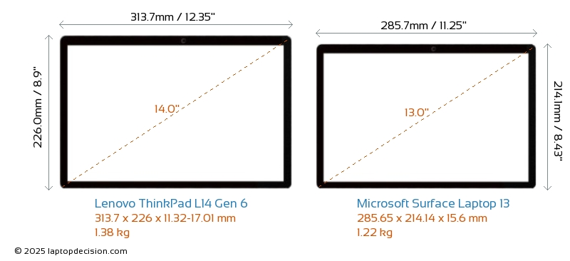 HDMI ThinkPad L14 Gen 6 cuenta con un puerto HDMI (1x HDMI 2.1) para conectar a monitores externos. Surface Laptop 13 no tiene puerto HDMI.