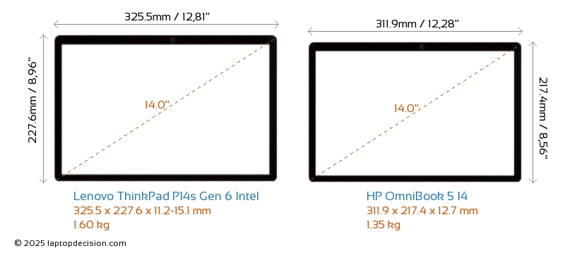 HDMI ThinkPad P14s Gen 6 Intel cuenta con un puerto HDMI (1x HDMI 2.1) para conectar a monitores externos. OmniBook 5 14 no tiene puerto HDMI.