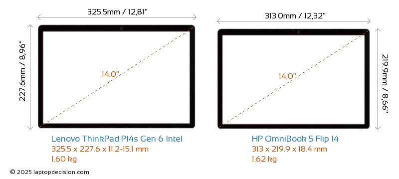 USBAmbos ThinkPad P14s Gen 6 Intel y OmniBook 5 Flip 14 cuentan con 2x USB 3.2 puertos USB-A.Ambos ThinkPad P14s Gen 6 Intel y OmniBook 5 Flip 14 tienen puertos USB Type-C. ThinkPad P14s Gen 6 Intel tiene 2x USB 4.0 puertos USB Type-C, mientras que OmniBook 5 Flip 14 tiene 2x USB 3.2 puertos USB Type-C.