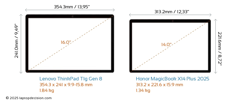 Thunderbolt ThinkPad T1g Gen 8 está equipado con un puerto Thunderbolt 5. MagicBook X14 Plus 2025 no tiene puerto Thunderbolt.