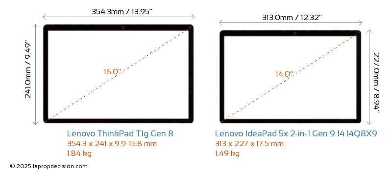 Thunderbolt ThinkPad T1g Gen 8 está equipado con un puerto Thunderbolt 5. IdeaPad 5x 2-in-1 Gen 9 14 14Q8X9 no tiene puerto Thunderbolt.