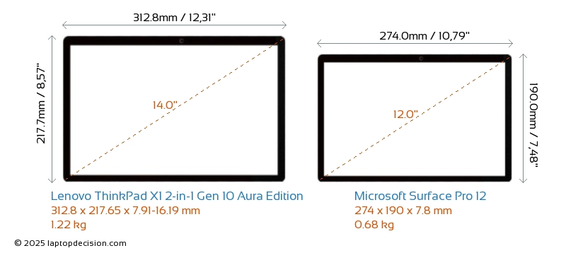 HDMI ThinkPad X1 2-in-1 Gen 10 Aura Edition cuenta con un puerto HDMI (1x HDMI 2.1) para conectar a monitores externos. Surface Pro 12 no tiene puerto HDMI.