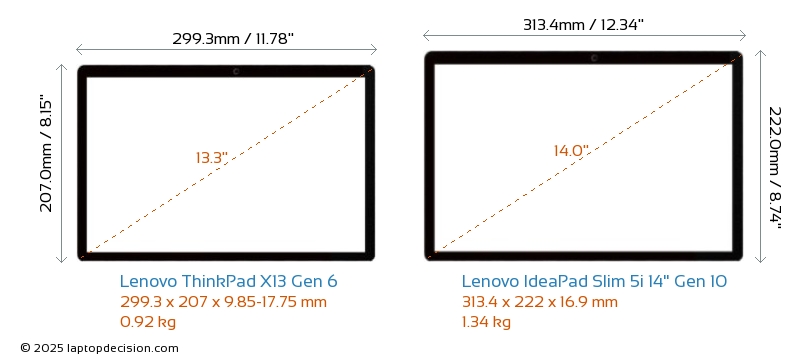 USBAmbos ThinkPad X13 Gen 6 y IdeaPad Slim 5i 14" Gen 10 cuentan con 2x USB 3.2 puertos USB-A.Ambos ThinkPad X13 Gen 6 y IdeaPad Slim 5i 14" Gen 10 tienen puertos USB Type-C. ThinkPad X13 Gen 6 tiene 2x USB 4.0 puertos USB Type-C, mientras que IdeaPad Slim 5i 14" Gen 10 tiene 2x USB 3.2 puertos USB Type-C.