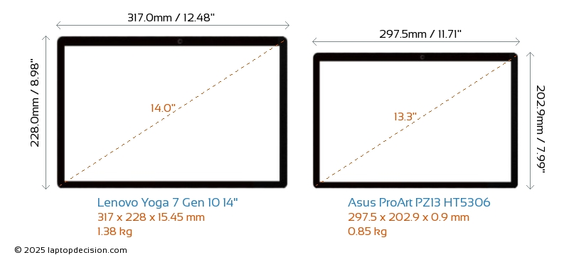 USB Yoga 7 Gen 10 14" está equipado con 1x USB 3.2 puertos USB-A. ProArt PZ13 HT5306 no tiene puertos USB-A.Ambos Yoga 7 Gen 10 14" y ProArt PZ13 HT5306 cuentan con 2x USB 4.0 puertos USB Type-C.