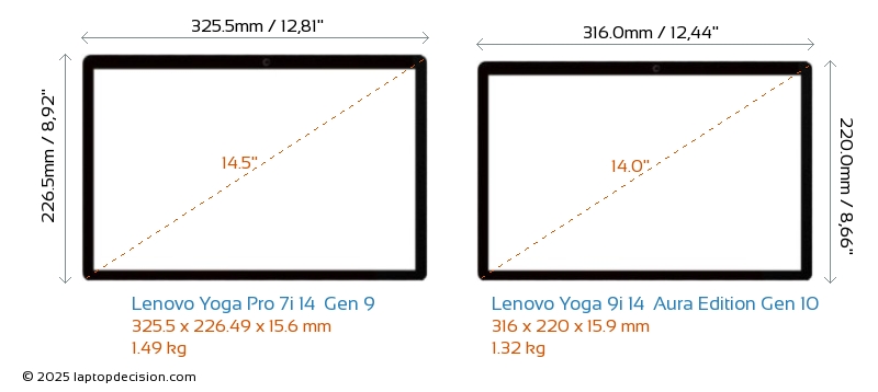 USBAmbos Yoga Pro 7i 14 Gen 9 y Yoga 9i 14 Aura Edition Gen 10 cuentan con 1x USB 3.2 puertos USB-A.Ambos Yoga Pro 7i 14 Gen 9 y Yoga 9i 14 Aura Edition Gen 10 tienen puertos USB Type-C. Yoga Pro 7i 14 Gen 9 tiene 2x USB 3.2 puertos USB Type-C, mientras que Yoga 9i 14 Aura Edition Gen 10 tiene 3x USB 4.0 puertos USB Type-C.