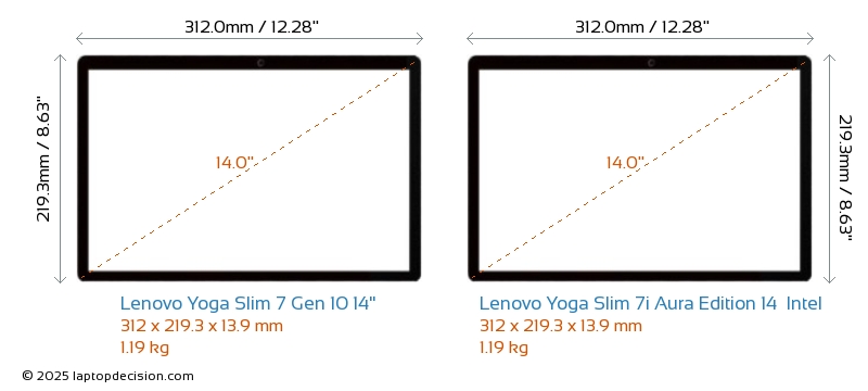 USBAmbos Yoga Slim 7 Gen 10 14" y Yoga Slim 7i Aura Edition 14 Intel cuentan con 1x USB 3.2 puertos USB-A.Ambos Yoga Slim 7 Gen 10 14" y Yoga Slim 7i Aura Edition 14 Intel cuentan con 2x USB 4.0 puertos USB Type-C.