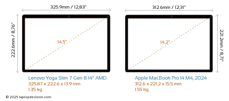 Thunderbolt MacBook Pro 14 M4, 2024 está equipado con un puerto Thunderbolt 4. Yoga Slim 7 Gen 8 14" AMD no tiene puerto Thunderbolt.