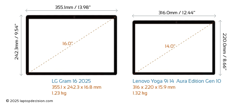 USBAmbos Gram 16 2025 y Yoga 9i 14 Aura Edition Gen 10 tienen puertos USB-A. Gram 16 2025 tiene 2x USB 3.2 puertos USB-A, mientras que Yoga 9i 14 Aura Edition Gen 10 tiene 1x USB 3.2 puertos USB-A.Ambos Gram 16 2025 y Yoga 9i 14 Aura Edition Gen 10 tienen puertos USB Type-C. Gram 16 2025 tiene 2x USB 4.0 puertos USB Type-C, mientras que Yoga 9i 14 Aura Edition Gen 10 tiene 3x USB 4.0 puertos USB Type-C.