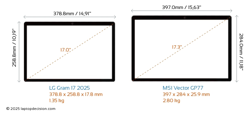 HDMIAmbos Gram 17 2025 y Vector GP77 cuentan con un puerto HDMI (1x HDMI 2.1) para conectar a monitores externos.