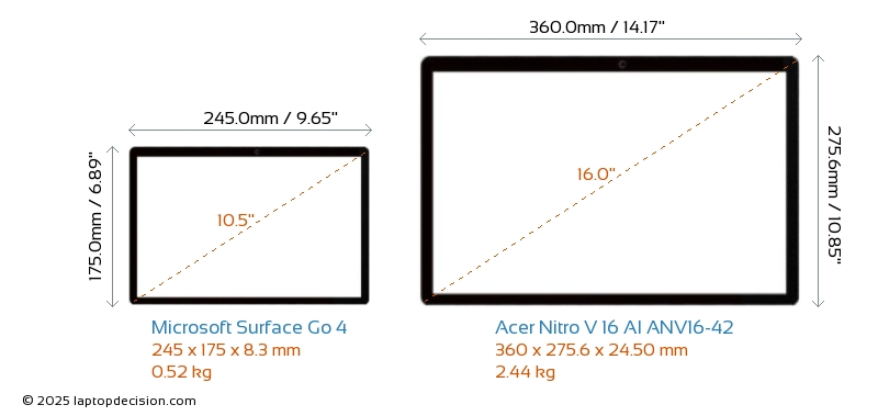 HDMI Nitro V 16 AI ANV16-42 cuenta con un puerto HDMI (1x HDMI 2.1) para conectar a monitores externos. Surface Go 4 no tiene puerto HDMI.